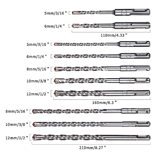 - 【10PCS SDS-Plus Rotary Hammer Drill Bits Set】 Included sizes – 5mm/6mm x 110mm, 5mm/6mm/8mm/10mm/12mm x 160mm, 8mm/10mm/12mm x 210mm. The 110mm length drill bits working lenghth is 50mm. The 160mm length drill bits working length is 100mm. The 210mm length drill bits working length is 150mm, so you can drill all common dowel holes.(In order to protect your machine and personal safety, please don't use a three-claw impact hand drill to drill holes!)