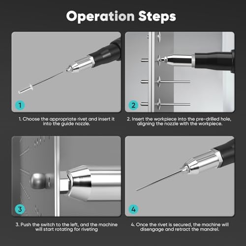 • 【ADJUSTABLE SPEEDS & EASY OPERATION】This rivet gun is incredibly easy to use; just insert the rivet and press the trigger for quick and efficient riveting. Comes with 4 adapters (2pcs 3/16 inch, 5/32 inch, 1/8 inch) for versatile application in various projects. With an infinite speed control function that allows for precise adjustments.