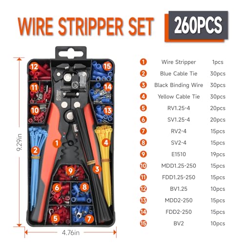 - 【COMPREHENSIVE KIT】Includes 1 multi-function 3-in-1 wire stripper, 169 insulated terminals of various sizes, 60 cable ties, and 30 black binding wires—everything needed for efficient wiring jobs.
