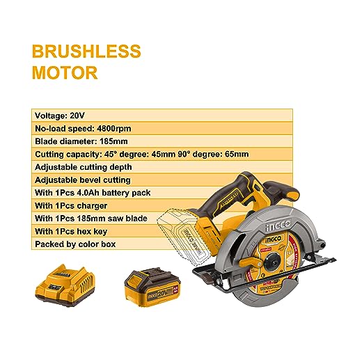 - What you can get: 1x brushless circular saw +1x185mm saw blade +1x 4.0Ah battery pack +1x fast charger +1x hex key