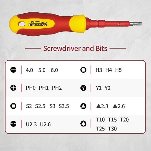 - 【Insulated Screwdriver Set】This screwdriver for men includes 1 handle, 1 voltage tester and 12 double-head blades: 3 Phillips, 3 Slotted, 5 Torx, 3 Hex, 4 Square, 2 U-Type, 2 Y-Type, 2 Triangular.