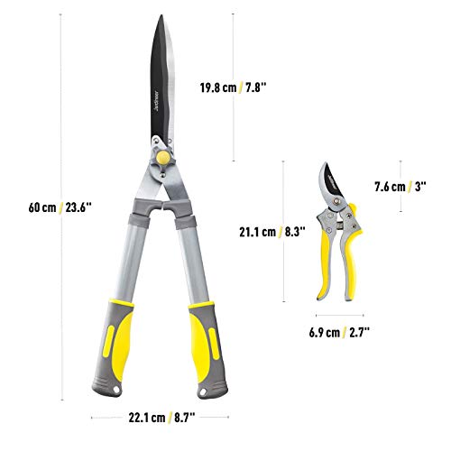 - 2PCS GARDEN SHEARS SET – 61cm Hedge Shears + 21cm Pruning Shears. If you’re a green hand or a skilled professional who are long for refreshing your garden, this is the perfect set for you. It saves your time, and makes the work efficient