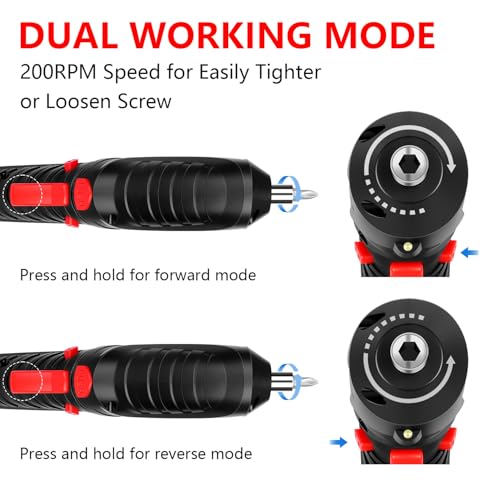- 【Rotate & F/R Buttons】①2 Handheld Shape: This drill gun can be adjusted from 120° to 180°, which is more convenient to use.② Forward/Reverse button allows the screwdriver to rotate between forward and reverse,electric screwdriver can be easily operated by pressing. Designed for the operation of screwdrivers only, NOT suitable for drilling