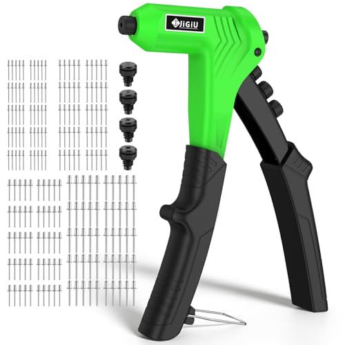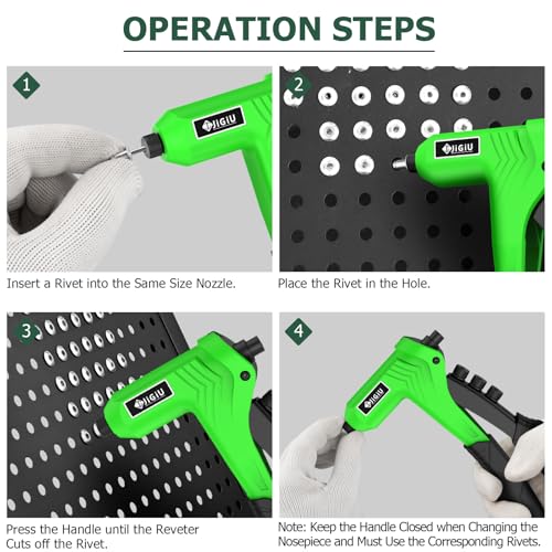 - 【Tool-free Interchangeable Rivet Heads】The 4 interchangeable rivet heads 2.4mm, 3.2mm, 4.0mm and 4.8mm are marked and stored on handle, don't need tools to change rivet heads, more efficient. And each rivet head is equipped with 50pcs aluminum rivets, JiGiU pop rivet gun provides you with everything while riveting
