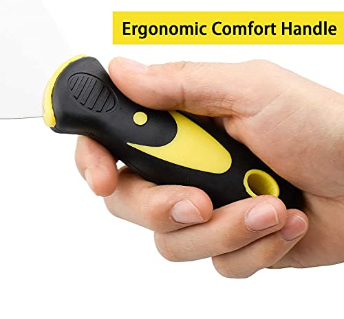 - Ergonomic Comfort Handle: The spackle knives are built with a large rubber handle gives you a comfortable edge to grasp, and let you work with minimal effort. The handle is also designed with a hole for easy hanging and storing. Unlike wooden handles, this non-slip handle will not decay in wet circumstances