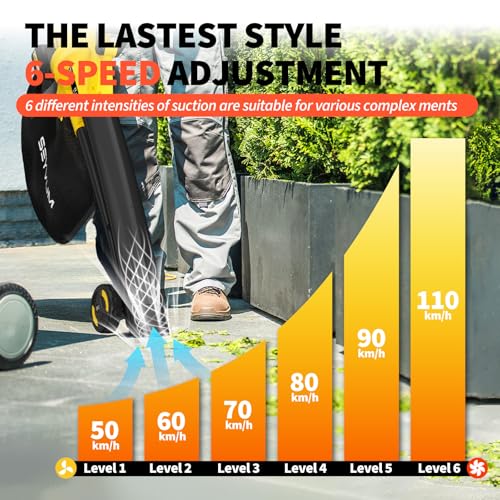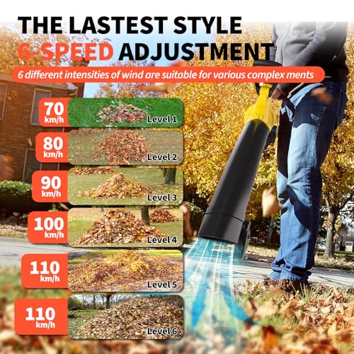 - Powerful 6-Speed Leaf Blower/Vacuum: Easy to use between blow and suction at the flick of the button.Blower have 6 variable Speed to adjust. Cordless garden vacuum have 6 different intensities of suction.You can addjust the suction speed according to your need. perfect for removing leaves from grass, gravel and any surface.