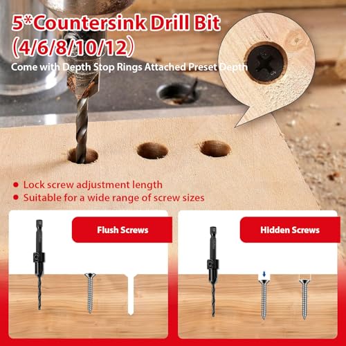 - High Quality Sharp Tapered Drill Bits for a Wide Range of Screws: Each of the 5 hardened M2 HSS drill bits features a tapered design for optimum cutting performance and minimum drag to reduce tool wear, with superior durability and sharpness to withstand wear and stay sharp for long periods of time. This range of countersink drill bits combines chip clearance and screw head concealment, outperforming standard bits to optimise chip clearance while concealing screw heads better than regular countersinks