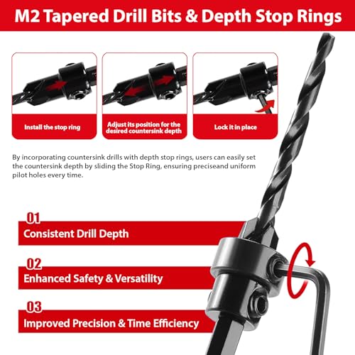 - Adjustable Depth Stop: Fitted with an Allen key and 2 fine adjustment stops (3/8‘ and 1/2’) for precise control of pilot hole depth. Depth can be adjusted with a locking screw for a variety of screw sizes. Unlike ordinary stops that loosen over time, our double screw locking mechanism prevents slippage even in hardwoods, making this countersink set ideal for professional countersinking in wood applications