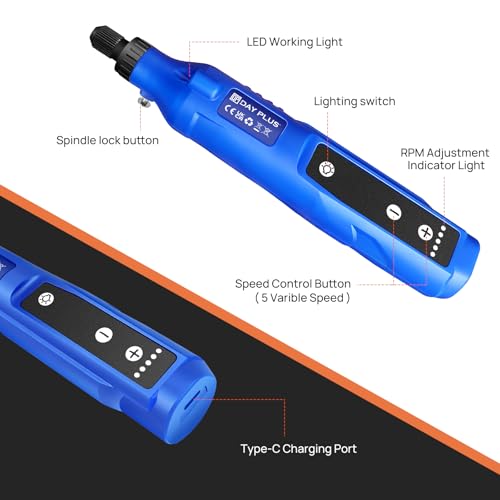 - 5-Speed Adjustable Setting: The mini rotary tool equipped with 5-speed model (3000/6000/9000/12000/18000 RPM), which makes it easier to adjust to a suitable speed to meet the power demand in different scenarios. It allows you to sand safely and carefully in stages. Even people without any experience can get started easily and control the speed easily.