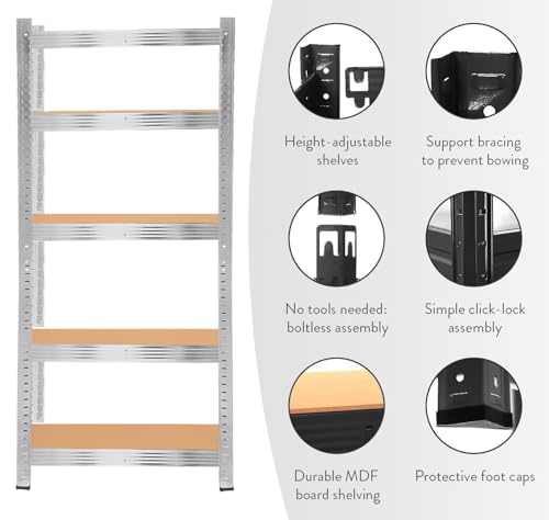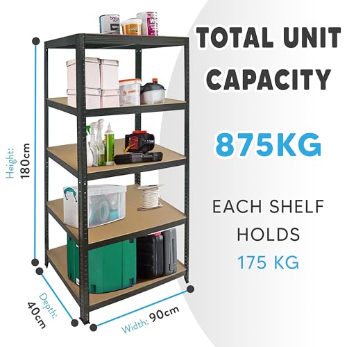 - STURDY AND LONGLASTING: Our shelves are constructed from durable, powder-coated metal, making it the ideal storage unit for any garage, shed, or home. The heavy-duty garage shelving units are equipped with support braces under each high-quality MDF board shelf to prevent bowing. Each shelf can hold 175 kg for a total unit capacity of 875 kg. With a solid construction built to last and meet all your storage needs, our garage shelving units are prepared to serve you well for years to come.