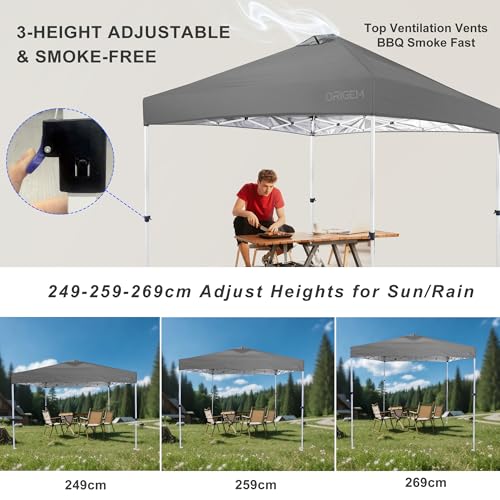 - Adjustable Height & Ventilation for All-Weather Comfort 3 height settings (249-259-269cm) adapt to sunshade or rain shelter needs. Top vents release BBQ smoke and heat while blocking leaks, ensuring airflow without compromising waterproofing