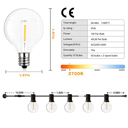Outdoor Festoon Lights Mains Powered 30M/100FT, Garden Lights Outdoor String Lights with 1W 50+2 Shatterproof G40 Bulbs for Patio, Backyard, Garden, Party, Wedding (Warm White)