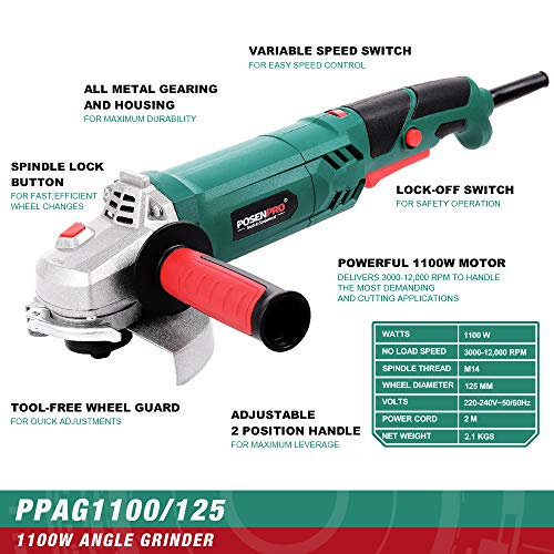 POSENPRO 125MM Corded Angle Grinder, 1100W Cut-Off/Angle Grinder Tool, Variable Speed 3000-12000RPM, 2-Position Side Handle for Metal Surface Cutting/Grinding/Polishing
