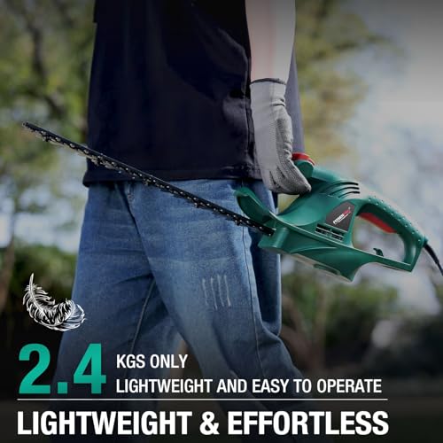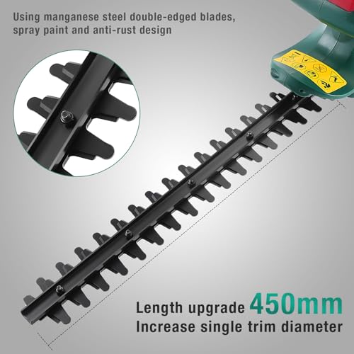 • 🍃【BUILT TO LAST】This hedge trimmer comes with a two-way safety switch and a hand protective guard to ensure your safety whilst operating. The protective shell to prevents and aids the blade from rust and wear, altogether to providing a safer and clean operation