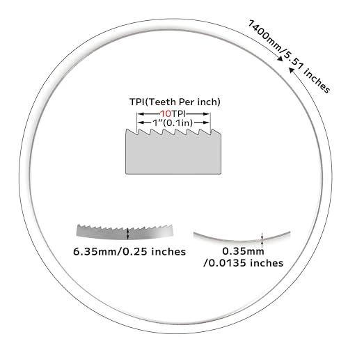 • Saw band specifications: Length: 1400mm (5.51 inches), Width: 6.35mm (0.25 inches), Thickness: 0,35mm (0.14 inches), TPI (teeth per inch): 10.