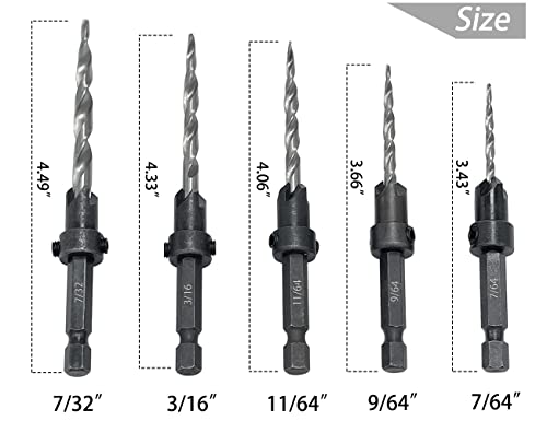 - 【Size】The wood drill bit is equipped with 5 different sizes 7/64", 9/64",11/64", 3/16", 7/32", covers the full range of screw sizes, meet your various needs.
