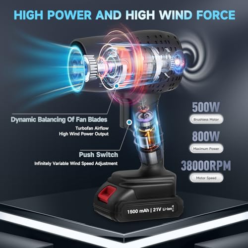 - Fast and Efficient Performance: Our air blower features a cutting-edge 12P large blade design with optimized curved blades, increasing efficiency by up to 60%. The 70mm oversized turbine fan blades enhance air intake volume, accelerating airflow for a high thrust of 650G. Powered by a robust 500W brushless turbo motor, this blower delivers exceptional power and efficiency, making it perfect for a variety of tasks including cleaning keyboards, computer hosts, car seats, and more.