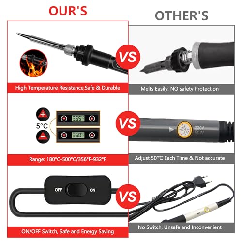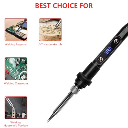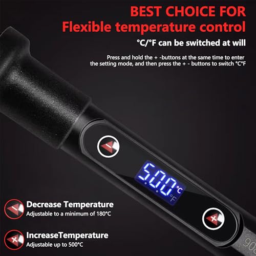- 𝟖𝟎𝐖 𝐋𝐂𝐃 𝐈𝐧𝐭𝐞𝐥𝐥𝐢𝐠𝐞𝐧𝐭 𝐓𝐞𝐦𝐩𝐞𝐫𝐚𝐭𝐮𝐫𝐞 𝐂𝐨𝐧𝐭𝐫𝐨𝐥 𝐒𝐲𝐬𝐭𝐞𝐦: This 𝗲𝗹𝗲𝗰𝘁𝗿𝗶𝗰 𝘀𝗼𝗹𝗱𝗲𝗿𝗶𝗻𝗴 𝗶𝗿𝗼𝗻 features an 𝟴𝟬𝗪 𝗵𝗶𝗴𝗵-𝗽𝗼𝘄𝗲𝗿 ceramic heating element with 𝗟𝗖𝗗 𝗱𝗶𝘀𝗽𝗹𝗮𝘆, allowing precise temperature adjustment (180-520°C). With accurate temperature control technology, this 𝘀𝗼𝗹𝗱𝗲𝗿𝗶𝗻𝗴 𝗶𝗿𝗼𝗻 𝘀𝘂𝗽𝗽𝗼𝗿𝘁𝘀℃/℉ unit switching to meet various solder requirements