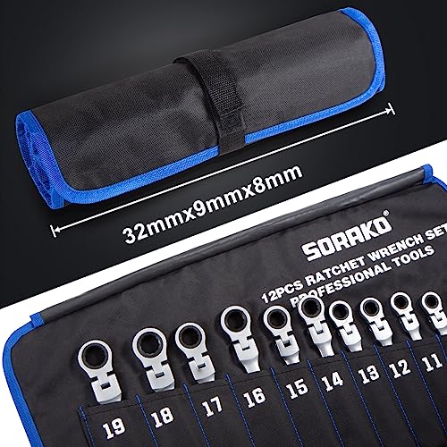 SORAKO Ratchet Spanner Set 12pcs, Flexible Combination Wrench 8-19 mm, Flex-Head Spanner Sets Combination Spanner in Roll Bag for Car Repairing, Industrial Maintenance, SRW12H2, Chrome