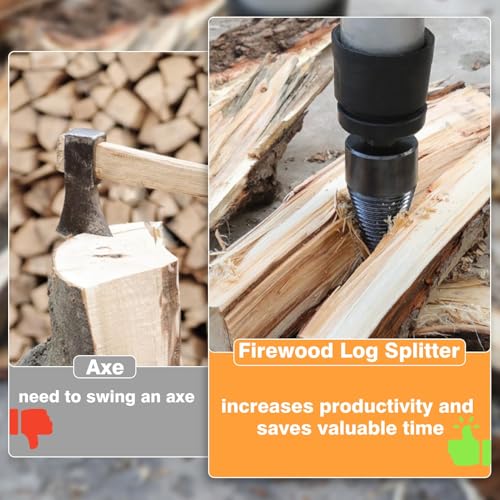 • 【MATERIAL】Made of high carbon steel with blackened surface treatment, it is not easy to break, sturdy and resistant to impact and abrasion.【CAUTION】Too hard or too wet wood is more difficult to split, when wood is large, to split more times, can not spilit thick wood at once; When splitting wood, please start splitting from the edge of the wood, do not start splitting from the middle, at the same tim, pay attention to fixing the wood to prevent the wood from rotating with the drill.
