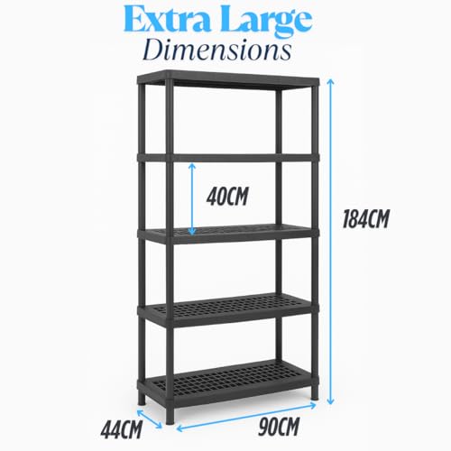 - Spacious and Efficient Design: The Extra Large dimensions 184 x 90 x 44 Cm offer ample room for larger tools, paint cans, and storage bins. All Plastic Storage shelves offers generous 40cm space in between each shelf, while the bottom tier has a 5cm clearance from the floor, perfect for easy cleaning
