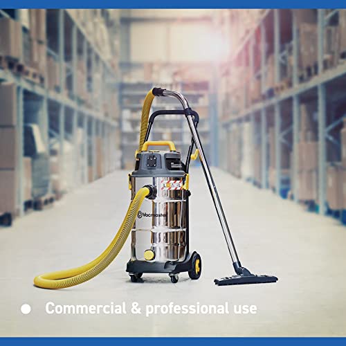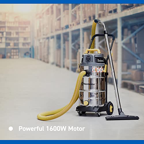 - HEAVY DUTY CONSTRUCTION – Heavy duty construction with 38L tank, suction tubes, castors and fittings all moulded from thick-skinned stainless steel. 9m cable with toughened PVC and reinforced anti-crush 38mm diameter hose system for collecting larger debris and large 15" floor head. Also features drainage plug for safe liquid disposal