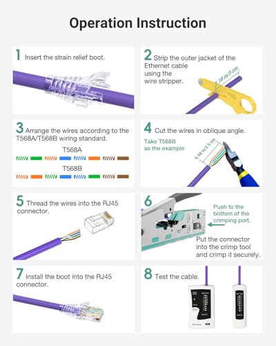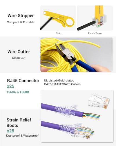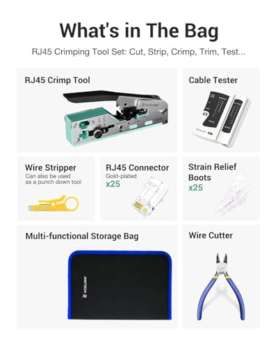 • COMPREHENSIVE ACCESSORIES: Come with 25 gold-plated pass-thru RJ45 connectors and strain relief boots, a wire cutter, and a mini stripper. With everything in a portable cloth bag, this RJ45 tool kit saves time, effort, and the cost of hiring help, ideal for DIYers