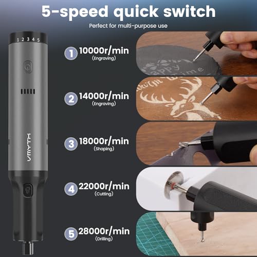 - Powerful & Professional : VMYTH iPen E2 Engraving Pen features a 7.2V high torque motor, delivering enhanced power output for demanding applications. with 5 variable speed control and a max speed of 28,000 RPM, it ensures precise compatibility with diverse materials and processing techniques. The high capacity battery sustains up to 50 minutes of continuous runtime, making it ideal for extended light duty projects such as grinding, carving, sanding, polishing, etching and drilling.