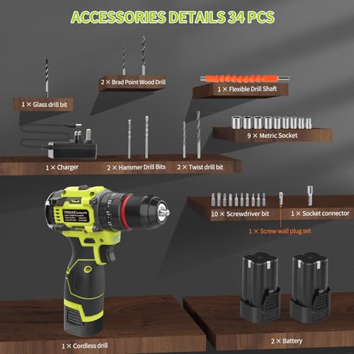 • 【34PCS Screwdriver Set】Cordless drill comes with 34 accessories. Including 1 × Cordless drill, 2 x 2000 mAh Battery, 1 x Charger , 2 × Brad Point Wood Drill, 2 × Twist drill bit, 2 × Hammer Drill Bits, 1 × Glass drill bit, 9 × Metric Socket, 10 × Screwdriver bit, 1 × Socket connector, 1 × Screwdriver bit connector, 1 × Flexible Drill Shaft, 1 × Instruction manual. The best gift for dad who likes to DIY at home.