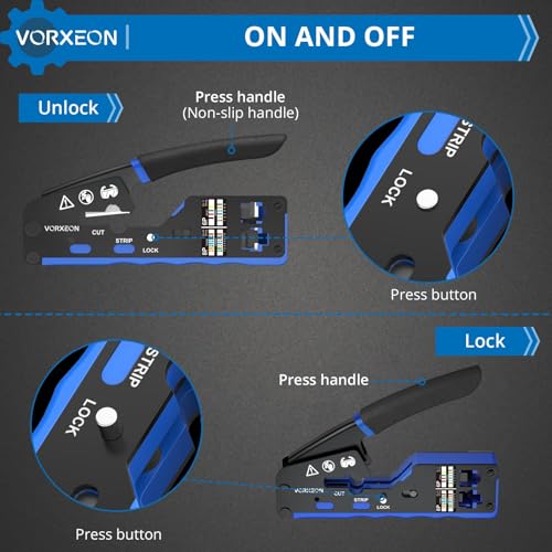 Versatile Use】VORXEON Cat6 Pass-Through Crimper works with Cat6 Ethernet (8P) and 6P phone lines (wider range than other crimpers). Upgraded blade (30% stronger cut) reduces uneven snips; 2 spare blades + right-hand grip for easy use.