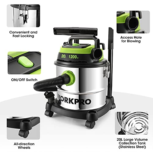 WORKPRO 1200W 20L Wet and Dry Vacuum Cleaner with HEPA, 3-in-1 Blower Function, Powerful Industrial Dust Extractor with Stainless Steel Tank for Indoor & Outdoor Cleaning