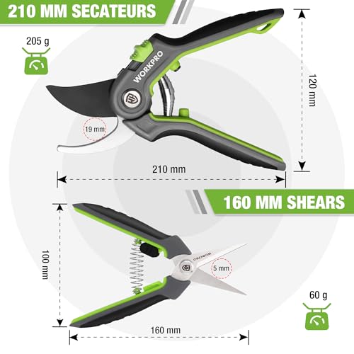 - Sharp and Durable Blades: The blades of 210 mm heavy duty bypass secateurs are made of SK5, which has the great sharpness and ensures a longer service life. And it can cut branches up to 19mm in diameter. While the blades of 160mm shear are made of stainless steel and can cut branches up to 5mm in diameter.