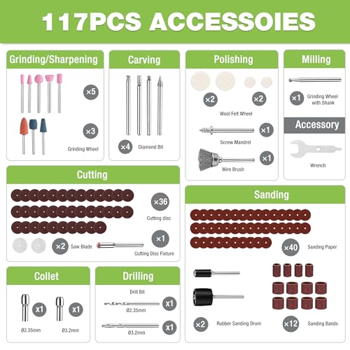 - 6 Gears Variable Speed – Equipped with a powerful motor, this multi-purpose rotary tool speed can be adjusted from 5000-30000RPM by short pressing the button. Allowing you to control the speed precisely according to various objects, helping you complete precise DIY works more efficiently and exquisitely