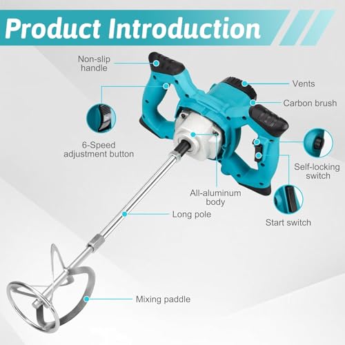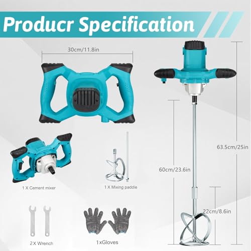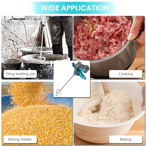 - 6 ADJUSTABLE SPEEDS&WIDELY USED:This concrete mixer have 1-6 switching speed for tackling a variety of different materials, Efficient and stable mixing process suitable for mixing concrete,grout,mud,paint,mortar,plaster,putty,meat stuffing, ect. After usage, you can easily detach the mixing head and rod for effortless cleaning and storing.