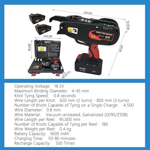 • The automatic rebar tying gun features two high-capacity (3600 mAh) lithium-ion batteries, each fully charged for approximately 4.5 hours of operations, meeting your long-term bundling needs