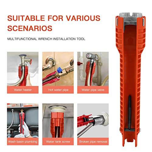 - Multi-function: 8-in-1 multi-function wrench is used for quick disassembly and assembly of kitchen water pipes, sinks and other joints. The size is 10" X1.9". The weight is 11.6 ounces. The nut is made of steel. It is more suitable for water supply nuts, shut-off valves, filters, water supply pipe nuts and tap nuts. This open slot provides easy access to existing power cords and is more cost-effective than traditional tools.