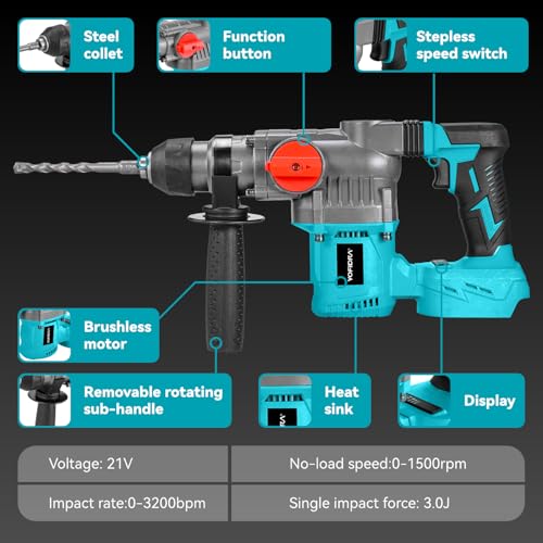 - 【Extended Runtime & Versatile Operation】This electric hammer drill includes two 3.0Ah lithium-ion batteries and a fast charger, enabling uninterrupted work. The left/right rotation switch enables quick and easy screw driving and removal, as well as tool-free bit changes, saving you time on the job.