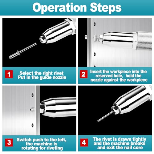 - 【Compatible with 4 Sizes of Rivets】- Capable of installing or pulling rivets of 4 sizes, include 3/16 inch (4.8 mm), 5/32 inch (4.0 mm), 1/8 inch (3.2 mm) and 3/32 inch (2.4 mm) aluminum core blind rivets. This cordless rivet tool supports rivet mode and rivet nut mode, you can choose different functions according to your needs.