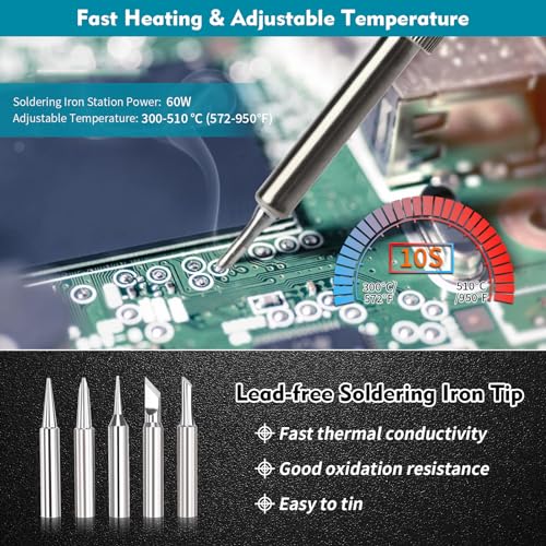 - 【Fast Heating & Adjustable Temperature】Soldering iron kit temperature 300-510 ℃(572-950℉ )can be adjusted, 10s fast heating. You can adjust the temperature according to your needs by pressing “+” “-” key, so you can apply this solder station in a wider range of applications.